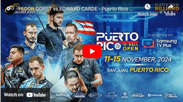 Event info and livescores: https://bit.ly/PrOpen ???? Puerto Rico Men’s Open by Samsung TV Plus ????️ Nov 11-15 ???? $64,000 ???? 64 players ⚙️ Non WPA sanctioned ????Puerto Rico Convention Center ▶ PBS Sponsors ▸ Predator Group ▸ Yalin ▸ Kamui ▸ VenBilliards Corporation ▸ Samsung TV Plus ▸ Little Monster ▸ Box Billiards ▶ Local Sponsors ▸ Medalla Light ▸ District Puerto Rico ▸ Discover Puerto Rico ▸ Puerto Rico Tourism Company ▸ Lotería de Puerto Rico/Lotería electrónica ▸ Popular ▸ Walmart ???? This event is played on Predator Apex pro pool tables covered with Predator Arcadia Performance Cloth, with Predator Arcos II balls and Predator Aerorack. ???? Official Equipment: https://probilliardseries.com/equipment/
