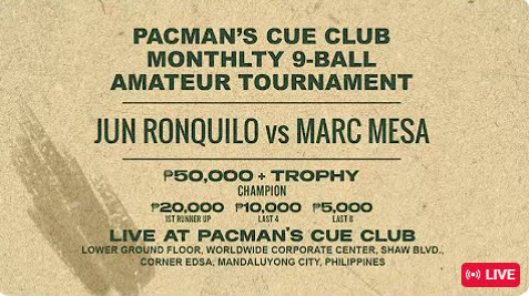 https://www.youtube.com/@pacmans.cueclub https://www.youtube.com/watch?v=vVzjFhBjlDg PACMAN’S CUE CLUB MONTHLY 9-BALL AMATEUR TOURNAMENT Jun Ronquilo VS Marc Mesa Live at Pacman’s Cue Club located at the Lower Ground Floor, Worldwide Corporate Center, Shaw Blvd., Corner Edsa, Mandaluyong City, Philippines Follow us for more updates PACMAN’S CUE CLUB
